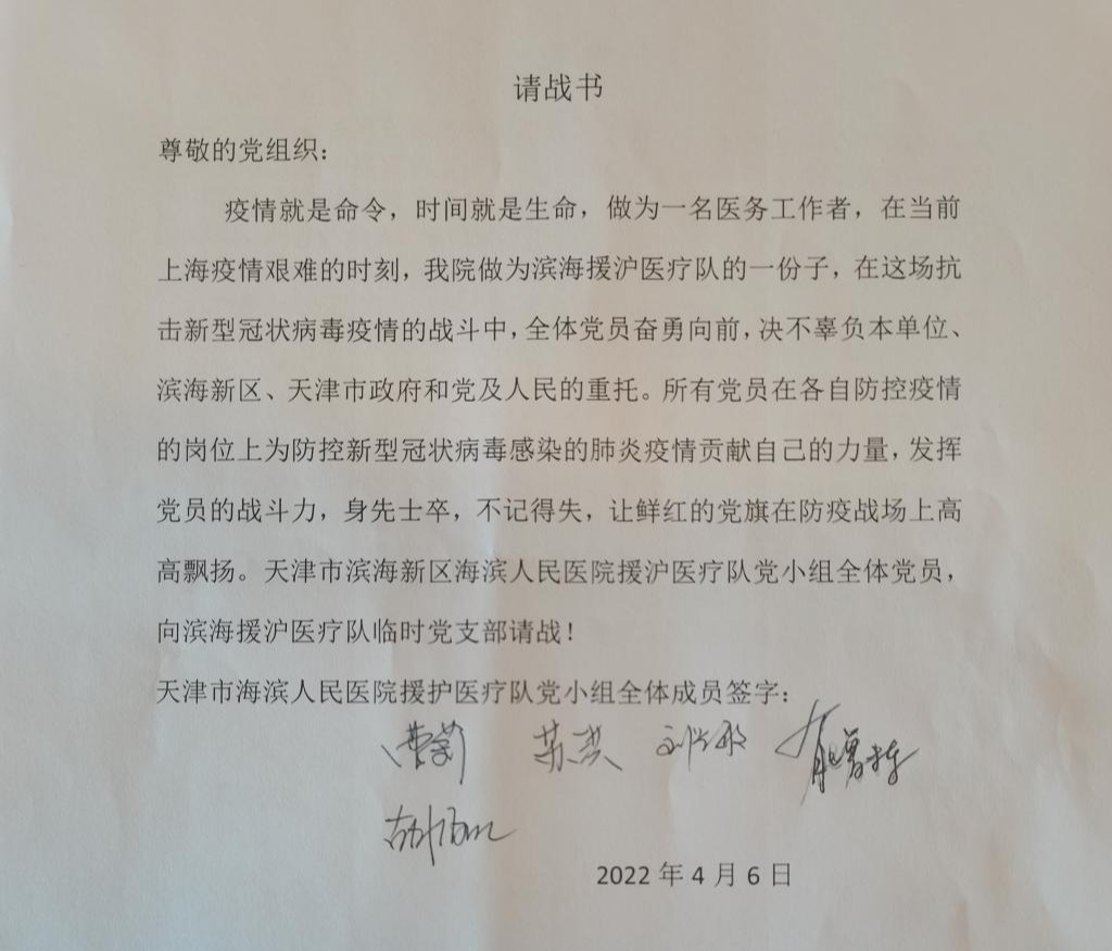 我们庄严地举起右手宣誓,看到墙壁上鲜红的党旗,我的内心无比澎湃,我深切感受到组织一直在身边,我们有强大的凝聚力。宣誓后所有党员主动请缨,毅然地书写下“请战书”,请求第一批奔赴方舱。