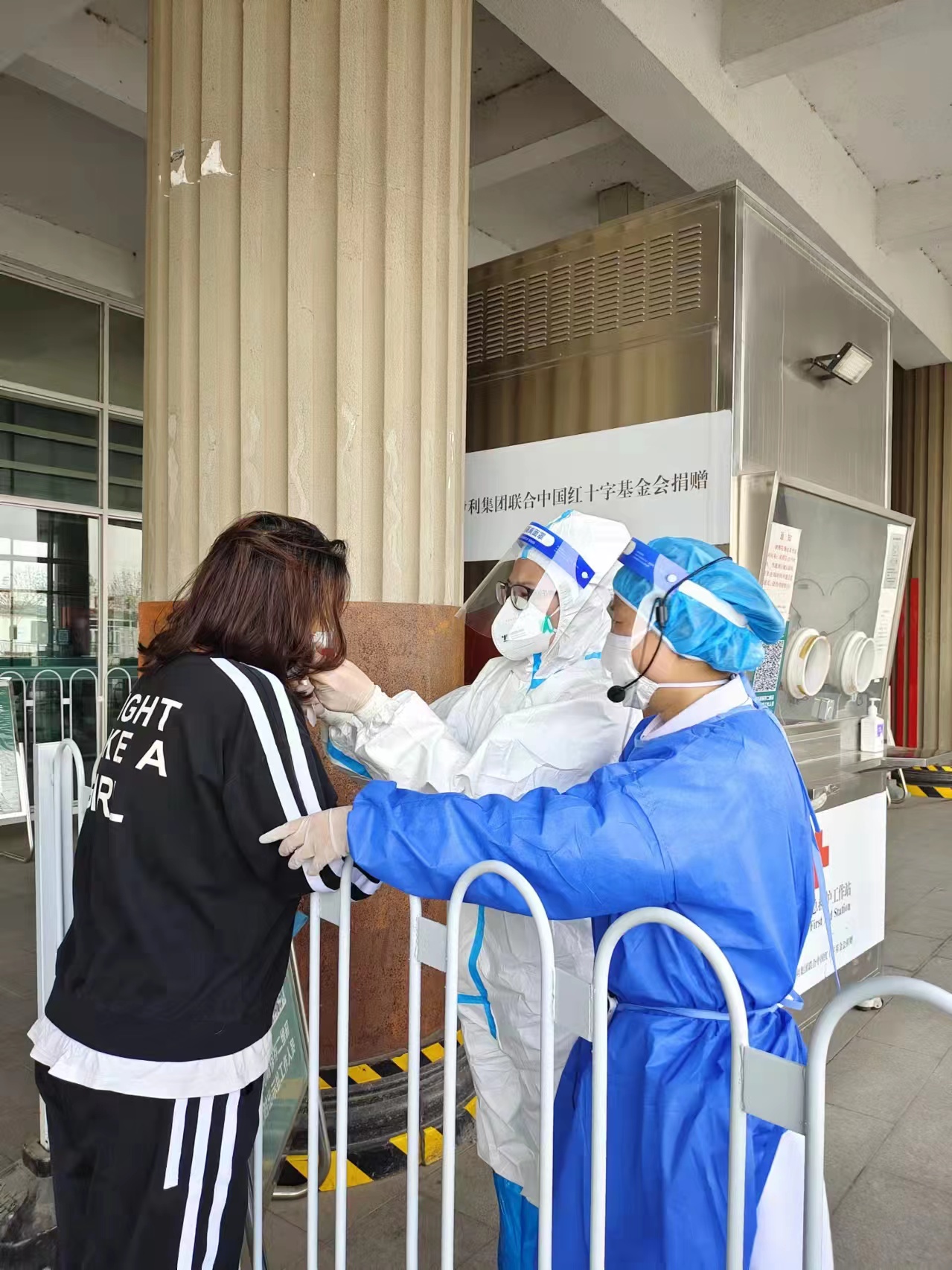 4月10日下午17时左右,一位老先生搀扶着一位女士步履蹒跚的从急诊出来,女士紧皱着眉头,表情很痛苦,两人缓慢的走到核酸检测入口处,询问道:“在急诊输液需要做核酸,怎么办手续?”