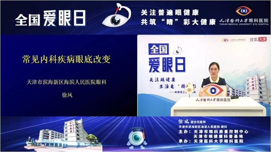 6月5日,眼科副主任徐凤,参加了由天津市眼科质量控制中心和天津市眼健康科普基地联合主办,天津医科大学眼科医院承办的“关注眼健康、生活更‘睛’彩”大型眼健康线上科普8小时不间断直播活动。为广大群众科普了《常见内科疾病眼底改变》。活动在央视频移动网、搜狐新闻、新浪新闻、百度、微博、优酷等11个平台同步直播,在线收看人数累计达514.3万人次。
