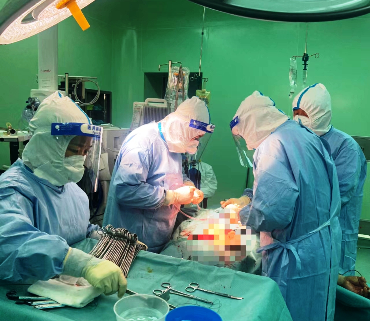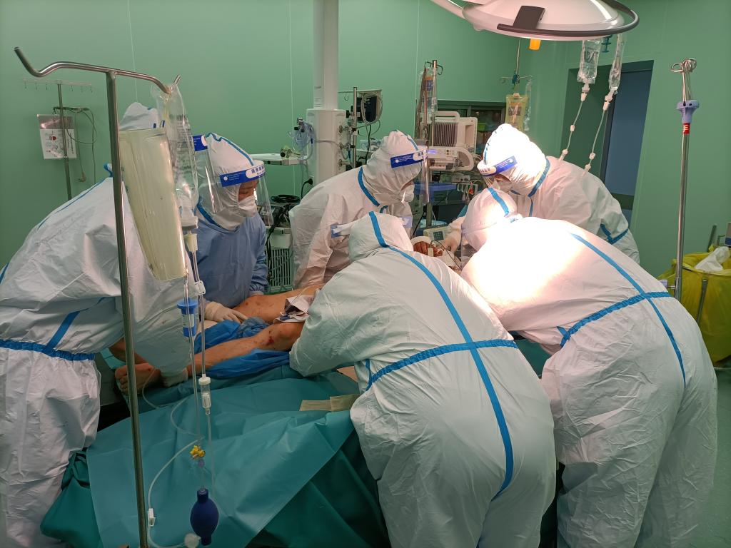 经气管插管后连接麻醉机,建立机械通气,清创探查手术也随之展开。术中探查比想象得更严重,患者腹腔有大量积血,多处肠管坏死。由于出血较多,患者血压进行性下降,命悬一线。紧急关头,手术医生麻醉医生通力配合,麻醉医生使用大量的升压药物、代血浆、血液制品等维持患者的血压。新区卫健委了解情况后高度关注,询问患者的伤情及手术进展情况,并给予充足的血源支持。手术团队成员各司其职,克服厚重的防护服的影响,止血、清创、结扎各环节有序推进,紧张的气氛充斥整间手术室。待腹部手术即将结束时,眼科、骨科医生随之进行会诊,协同外科手术医师一同为患者进行其他部位外伤清理缝合术。经过5个小时紧张而忙碌的抢救,手术顺利完成,患者生命体征逐步平稳,转送重症监护病房。目前患者病情尚稳定,各项指标正在慢慢的恢复中。