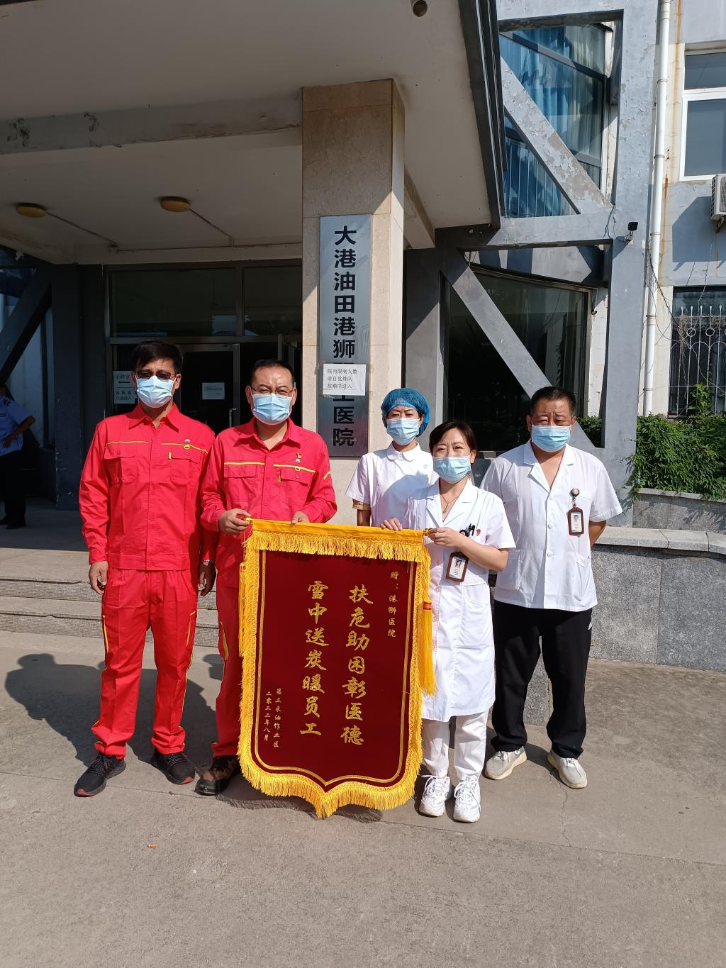 2022年8月17日上午,烈日炎炎下,第三采油厂作业区书记、安全总监、宣传干事一行数人携带锦旗来到保健医学科港狮门诊部,诚挚感谢门诊部医护人员临危受命,成功救治在岗位上晕倒的一名女职工。作业区书记及安全总监动情的说:职工晕倒在工作岗位上,我们心急如焚,束手无策,知道你们冒着高温凌晨大筛刚回来,那么累,一个电话,你们又快速的到达救助现场,成功的救治了我们采油厂职工,真是太感谢了!关键时刻企医共建一家亲啊!