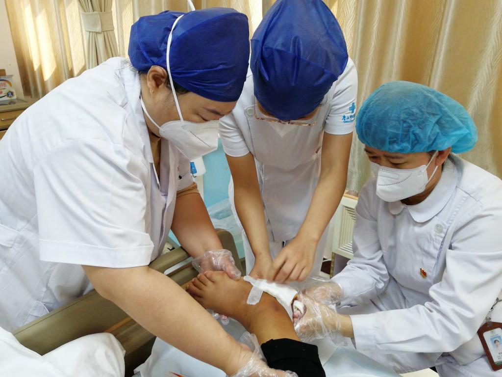 近年来,海滨人民医院伤口造口护理方面取得长足发展。目前,已开展伤口造口门诊,实施以伤口造口专科护士为主导,骨科、外科、内分泌科等多学科合作的医护一体的诊疗工作模式,全程为患者处理伤口。治疗中树立整体治疗观念,全面了解患者基础病变情况,根据血管性、神经病变性、糖尿病、自身免疫病等不同疾病所形成的创面,在全身治疗的基础上,采用个性化的诊疗手段,结合现代伤口管理理念(湿性愈合),对各类伤口展开规范化、系统化治疗。