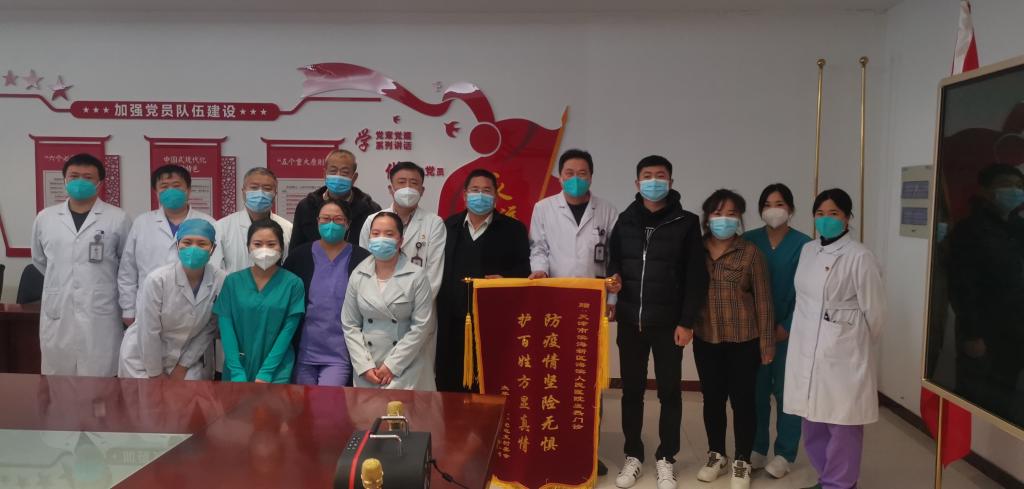 锦旗来自于郭庄子村委会。6日上午11时,镇政府刘主任、郭庄子村村长、副村长等一行4人,代表全体村民向海滨人民医院赠送锦旗。娄永忠院长、李斌副院长、王涛助理及发热门诊部分医务人员迎接,并就近期疫情防控工作进行交流。