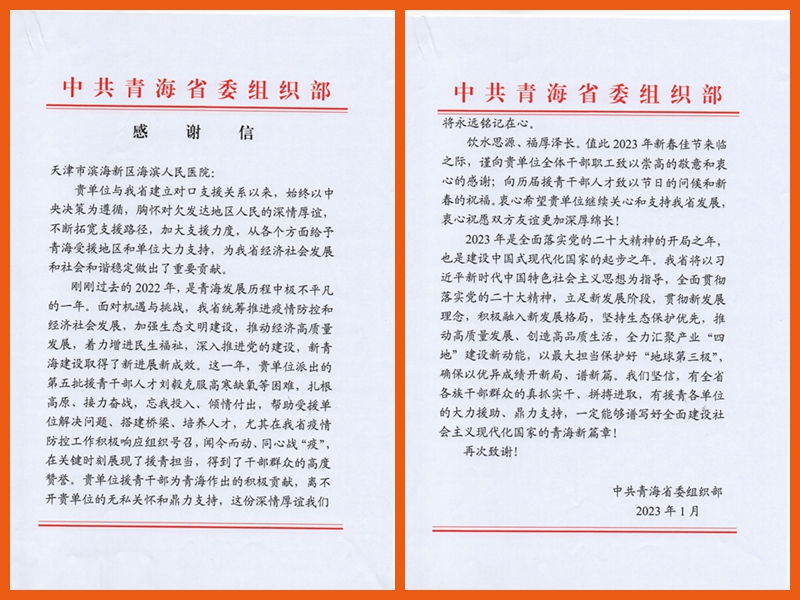 (通讯员 张慧莲)1月20日,海滨人民医院收到一封来自中共青海省委组织部的感谢信,在寒冷冬日让人倍感温暖。在兔年春节即将到来之际收的这份特别的礼物,让人倍感喜悦。