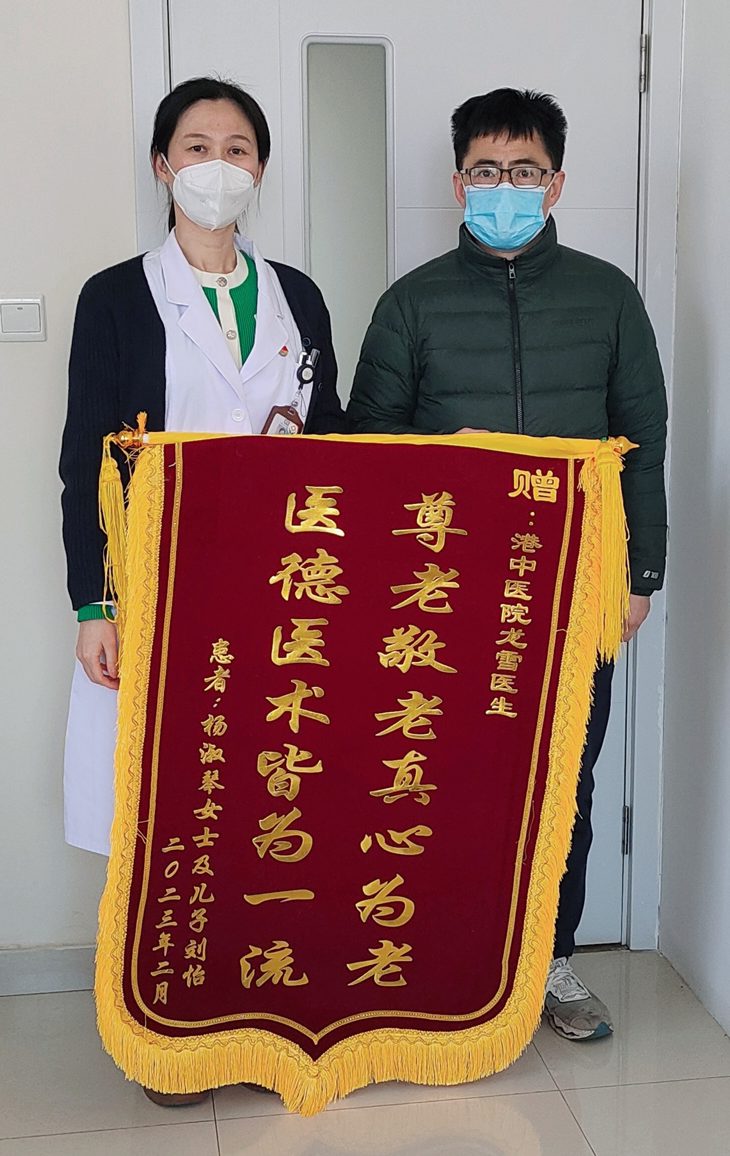 2月8日一大早,居民刘先生满怀感激地给幸福社区卫生中心送来一面锦旗。原来,刘先生的母亲是该中心龙雪医生管理的重点人群,由于大娘身患癌症,在年初感染新冠后,龙医生每天询问病情、指导用药、联系化验检查,借助医联体服务平台,帮老人解决疾病困扰,使大娘平安“阳康”。