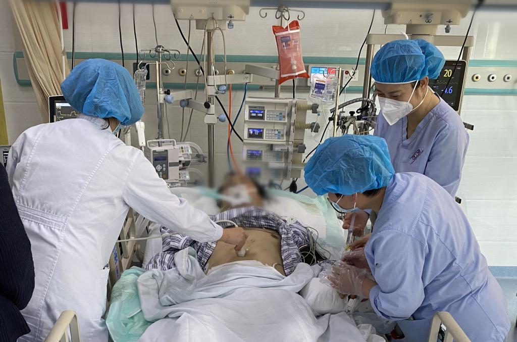 刚到病房,患者病情突然加重,血压极低,周身湿冷。在场的MDT团队和护士配合迅速实施抢救,予以持续多功能重症监护和气管插管、补液、输血、止血及抗休克治疗.....随着监护仪上逐渐稳定的心律,患者休克状态得到改善,为患者赢得宝贵时间。目前患者基本情况稳定,已安转上级医院继续救治。