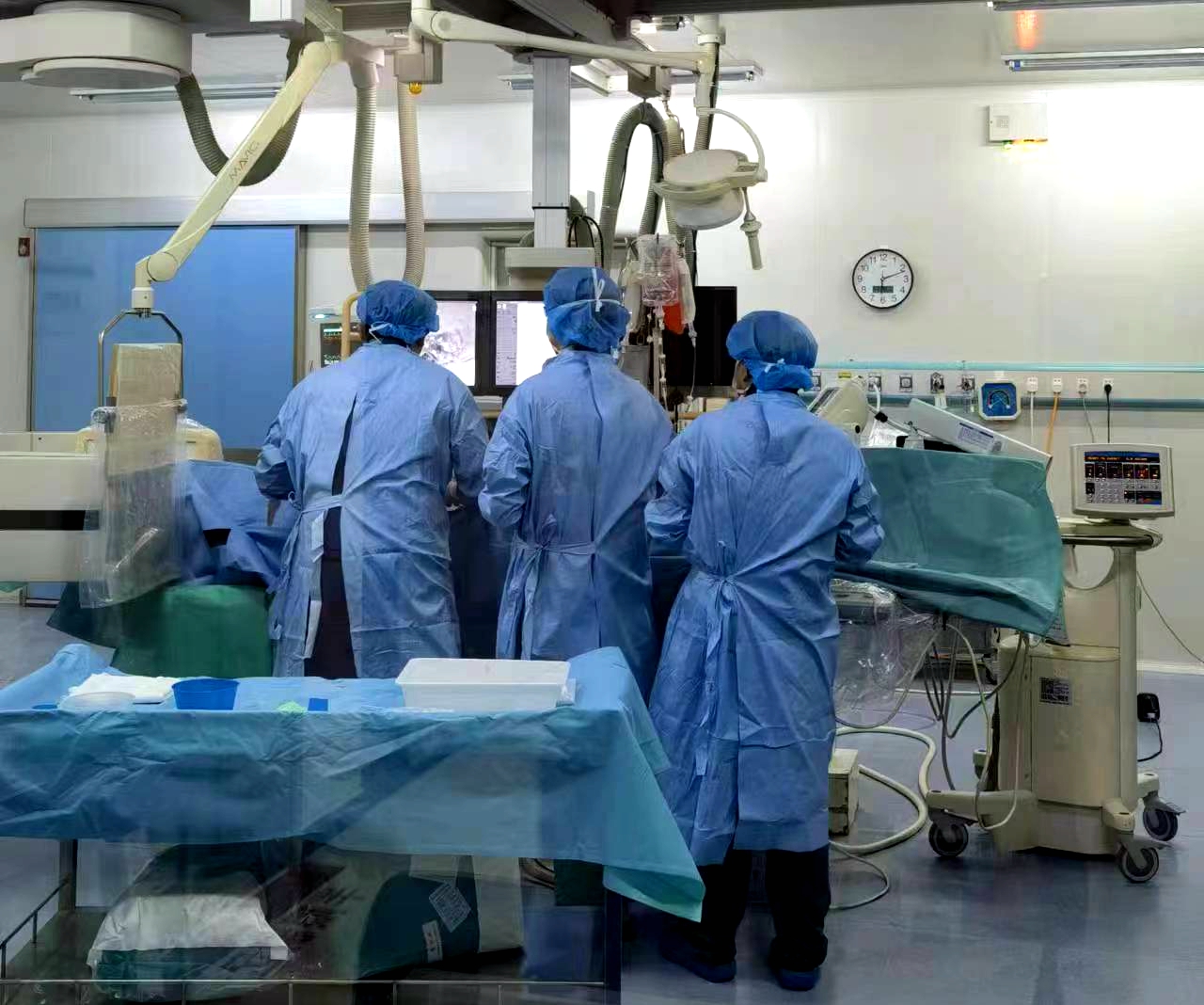 随着麻醉医生完成气管插管置,患者生命体征逐渐稳定,医护团队开始施行介入下脑动脉瘤的弹簧圈栓塞术。“血管弯曲多、角度大,导丝不好到位”,“回撤导丝,换个角度旋转一下。稳住导丝、导管跟上…..”,手术医生目不转睛地盯着显示屏,手里精准操作,技师根据要求,随时更新显示屏上的影像图片,配台护士,密切观察患者的生命体征。所有人分工明确、各司其职,导管室里安静的只剩下监护仪发出的清脆、有节奏的滴答声。随着5枚弹簧圈精准地填塞在动脉瘤的瘤腔内,造影显示:动脉瘤栓塞成功了!大家都替大娘由衷地感到高兴,铅衣的厚重、刷手衣裤上的斑斑汗渍,在此时都显得格外有意义。