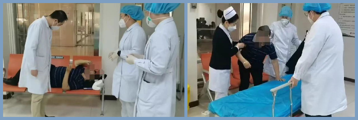 杨护士为其测量脉搏,观察意识,进行紧急施救,王护士立即联系门诊大夫前来察看。接到电话的内分泌科高鹏飞副主任与并发症检测中心护士携带设备从二楼诊区迅速奔往采血室。因患者做胰岛功能释放试验来诊,在喝完糖水并采完第二针静脉血突然出现不适,高主任指示检测手指血糖,结果为22.6毫摩尔/升。此时患者疼痛症状仍不缓解,高大夫立即与急诊医学科联系转运事宜。检验科王主任联系患者家人,得知其家人在外地暂时回不来。而此时患者疼痛又加剧了,持续出汗,口唇苍白、颤抖抽泣,护士蹲下来一边帮忙擦汗,一边观察病情,并不断的安慰说:“别紧张,一会儿急诊科就过来接您,做个系统检查,我们也一直在,放心吧!” 在场的医护人员迅速联动救治,分工协作、有条不紊,经过紧张且有序地忙碌,患者在现场工作人员的守护和安抚下,情绪放松下来。此时急诊医学科工作人员推着平车到达,护送患者到急诊进行进一步诊查。