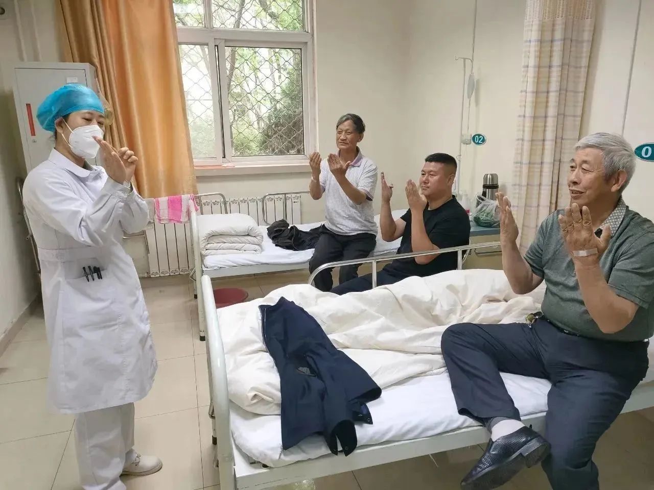 护士老师们耐心地演示讲解,患者及家属很认真的学习,学习气氛轻松愉悦。患者家属表示:“在你们这儿住院真好,环境安静,还教健康手指操,这个锻炼方法很实用!”