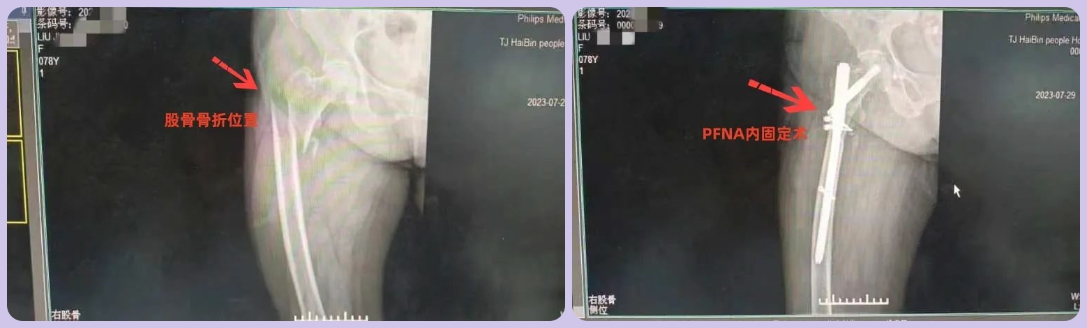患者活动时不慎摔倒,检查确诊为右股骨骨折。经过全面检查、评估,结合老人身体情况,骨科团队建议行骨折切开复位髓内针(PFNA)内固定术。征求家属同意后,邀请天津医院专家指导完成手术。