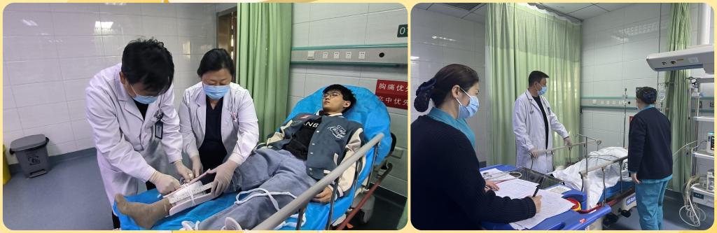 “滴滴”120告知系统信息提示接诊,演练正式拉开序幕。医护人员严格按照救治流程,立即通知科主任、护士长、医务科,启动MDT团队,通知神经外科、骨科、胸心外科、重症医学科做好接诊准备。