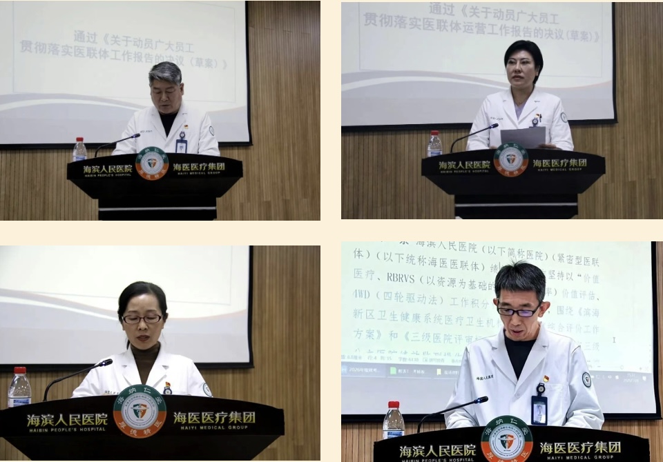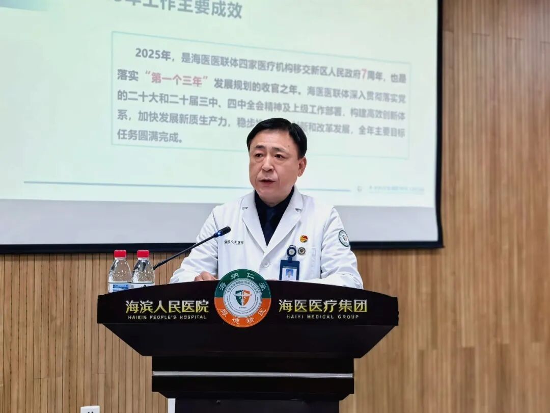 医联体四家医疗机构法定代表人娄永忠同志作题为《创新求变 质效图强 培育发展新质生产力 为海医医联体高质量发展添薪蓄能》的工作报告。报告全面总结了2025年医院在党建引领、学科建设、医疗服务、科研创新、质量安全与管理等方面取得的显著成绩与突破,在充分肯定过去一年工作的同时,客观分析了医联体当前面临的机遇与挑战,并对2026年工作目标与任务进行了明确部署。