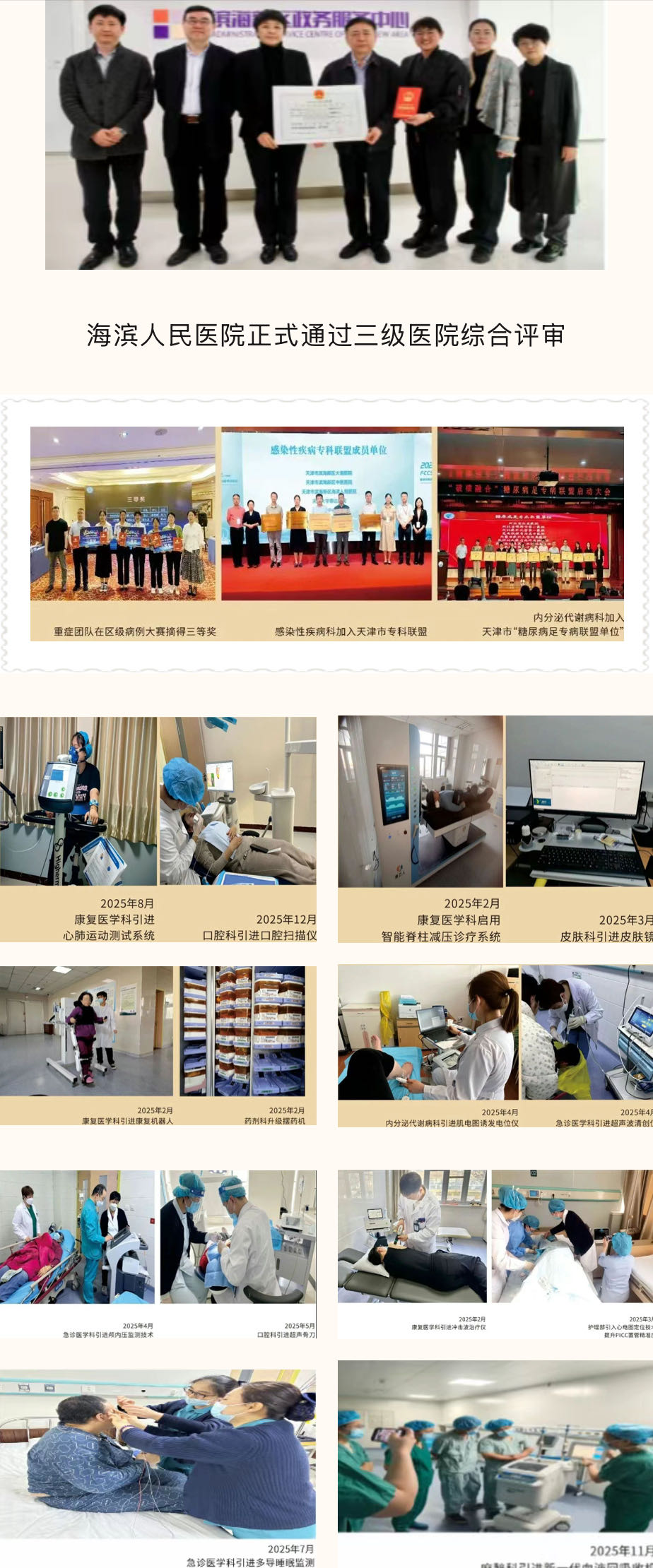 这一年,我们夯基拓进,让“实干争先”铸就卓越台阶。2025年3月,医院正式晋级为三级综合医院,迈入发展新阶段。年内相继获批中国抗癌协会(CACA)“整合药学+临床”全程管理护航工程联动病房,感染性疾病科、内分泌代谢病科分别加入天津市专科联盟及糖尿病足专病联盟。硬件升级同步推进,完成10个病区改造,就医环境显著优化。引进康复机器人、超声骨刀、心肺运动测试系统、智能脊柱减压系统等先进设备,持续推进重点专科建设。海医以“一体六翼”战略为指引,服务能力持续向好。