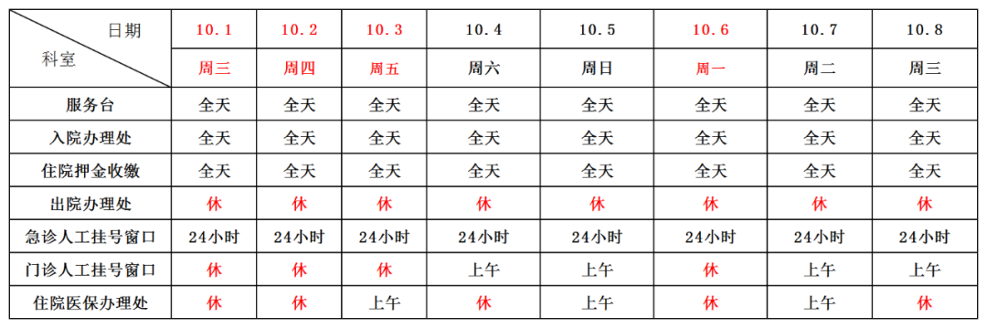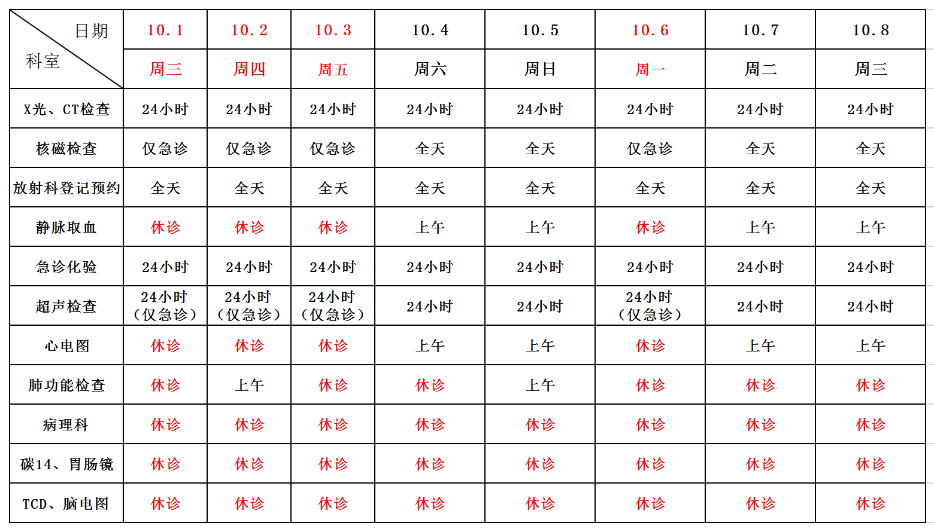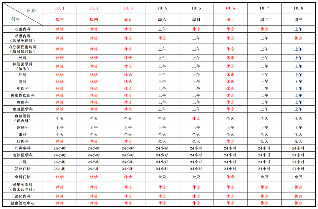 就诊指南 网站首页 > 便民服务 > 就诊指南 > 正文 海滨人民医院2025年国庆、中秋假期门急诊应诊安排 发布:浏览量:时间:2025-09-28 14:52 国庆节放假安排 1、10月1日至3日、6日法定节假日,门诊休诊,其他时间门诊仅上午半日开诊。 2、急诊、儿科、发热门诊、肠道门诊24小时开诊。 3、各专科、检查化验、服务窗口开诊情况请见附表。 注:门诊出诊情况,可通过“津医保”APP了解。 门、急诊出诊安排 检验检查安排 服务窗口安排