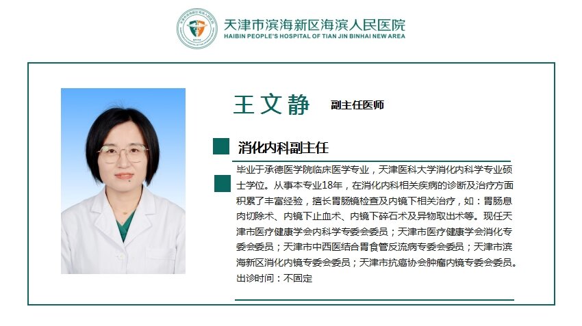 专家介绍 网站首页 > 医生介绍 > 专家介绍 > 正文 王文静 消化内科 消化内科副主任,毕业于承德医学院临床医学专业,消化内科学专业硕士学位,副主任医师职称。从事本专业18年,在消化内科相关疾病的诊断及治疗方面积累了丰富经验,擅长胃肠镜检查及内镜下相关治疗,如:胃肠息肉切除术、内镜下止血术、内镜下碎石术及异物取出术等。现任天津市医疗健康学会内科学专委会委员;天津市医疗健康学会消化专委会委员;天津市中西医结合胃食管反流病专委会委员;天津市滨海新区消化内镜专委会委员;天津市抗癌协会肿瘤内镜专委会委员。 出诊时间:不固定