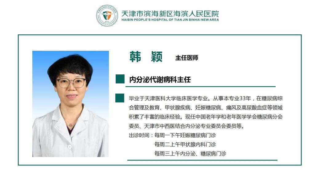 专家介绍 网站首页 > 医生介绍 > 专家介绍 > 正文 韩颖 内分泌代谢病科(风湿免疫科) 内分泌代谢病科主任,毕业于天津医科大学临床医学专业,主任医师职称。从事本专业33年,在糖尿病综合管理及教育、甲状腺疾病、妊娠糖尿病、痛风及高尿酸血症等领域积累了丰富的临床经验。现任中国老年学和老年医学学会糖尿病分会委员、天津市中西医结合内分泌专业委员会委员等。 出诊时间:周一下午妊娠糖尿病门诊; 周二上午甲状腺内科门诊;周三上午内分泌、糖尿病门诊