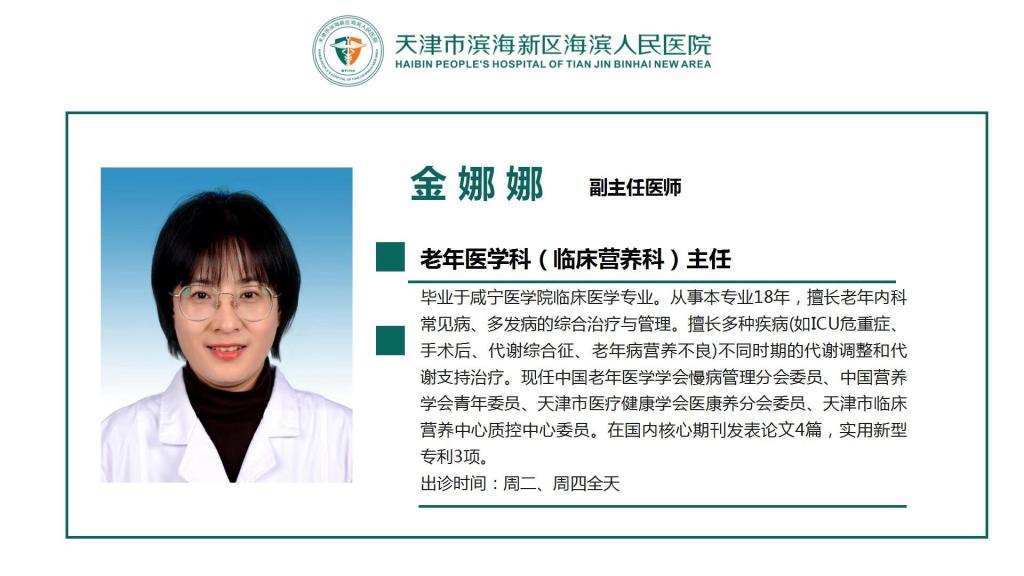 专家介绍 网站首页 > 医生介绍 > 专家介绍 > 正文 金娜娜 老年临床医学科(临床营养科) 老年临床医学科(临床营养科)主,毕业于咸宁医学院临床医学专业,副主任医师职称。从事本专业18年,擅长老年内科常见病、多发病的综合治疗与管理。擅长多种疾病(如ICU危重症、手术后、代谢综合征、老年病营养不良)不同时期的代谢调整和代谢支持治疗。现任中国老年医学学会慢病管理分会委员、中国营养学会青年委员、天津市医疗健康学会医康养分会委员、天津市临床营养中心质控中心委员。在国内核心期刊发表论文4篇,实用新型专利3项。 出诊时间:周二、周四全天