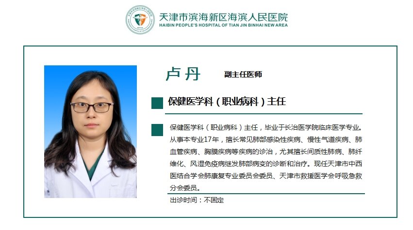 专家介绍 网站首页 > 医生介绍 > 专家介绍 > 正文 卢丹 呼吸与危重症医学科 保健医学科(职业病科)主任,毕业于长治医学院临床医学专业, 副主任医师职称。从事本专业17年,擅长常见肺部感染性疾病、慢性气道疾病、肺血管疾病、胸膜疾病等疾病的诊治,尤其擅长间质性肺病、肺纤维化、风湿免疫病继发肺部病变的诊断和治疗。现任天津市中西医结合学会肺康复专业委员会委员、天津市救援医学会呼吸急救分会委员。 出诊时间:不固定