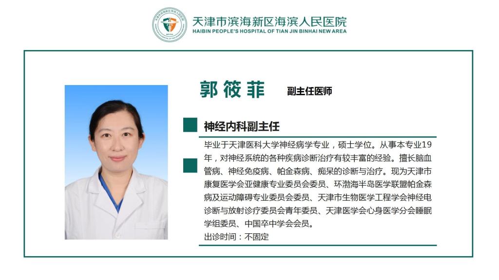 专家介绍 网站首页 > 医生介绍 > 专家介绍 > 正文 郭筱菲 神经内科(精神心理科) 神经内科副主任,毕业于天津医科大学神经病学专业,硕士学位,副主任医师职称。从事本专业19年,对神经系统的各种疾病诊断治疗有较丰富的经验。擅长脑血管病、神经免疫病、帕金森病、痴呆的诊断与治疗。现为天津市康复医学会亚健康专业委员会委员、环渤海半岛医学联盟帕金森病及运动障碍专业委员会委员、天津市生物医学工程学会神经电诊断与放射诊疗委员会青年委员、天津医学会心身医学分会睡眠学组委员、中国卒中学会会员。 出诊时间:不固定