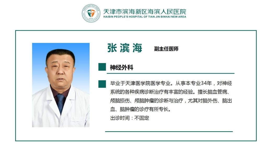 专家介绍 网站首页 > 医生介绍 > 专家介绍 > 正文 张滨海 神经外科 毕业于天津医学院医学专业,副主任医师职称。从事本专业34年,对神经系统的各种疾病诊断治疗有丰富的经验。擅长脑血管病、颅脑损伤、颅脑肿瘤的诊断与治疗,尤其对脑外伤、脑出血、脑肿瘤的诊疗有所专长。 出诊时间:不固定