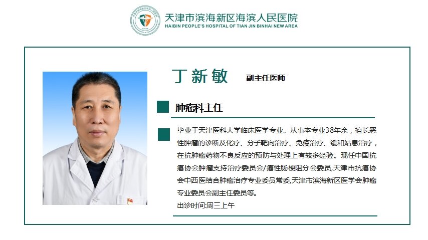 专家介绍 网站首页 > 医生介绍 > 专家介绍 > 正文 丁新敏 肿瘤内科(血液内科) 肿瘤科主任,毕业于天津医科大学临床医学专业,副主任医师职称。从事本专业38年余,擅长恶性肿瘤的诊断及化疗、分子靶向治疗、免疫治疗、缓和姑息治疗,在抗肿瘤药物不良反应的预防与处理上有较多经验。现任中国抗癌协会肿瘤支持治疗委员会委员;癌性肠梗阻分会委员;天津市抗癌协会中西医结合肿瘤治疗专业委员常委;天津市滨海新区医学会肿瘤专业委员会副主任委员等。 出诊时间:周三上午