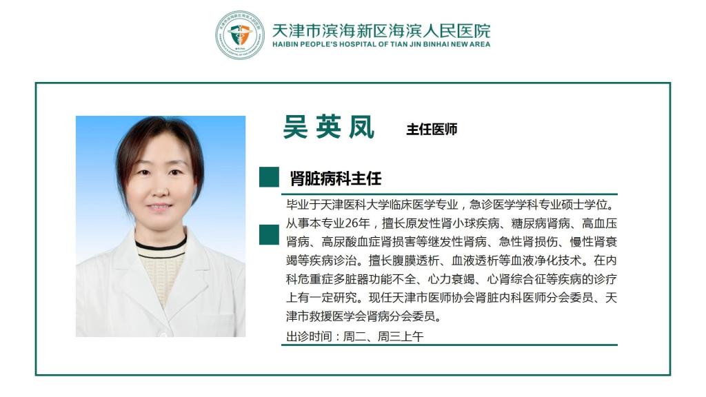 专家介绍 网站首页 > 医生介绍 > 专家介绍 > 正文 吴英凤 肾脏病科 肾脏病科主任,毕业于天津医科大学临床医学专业,急诊医学学科专业硕士学位,主任医师职称。从事本专业26年,擅长原发性肾小球疾病、糖尿病肾病、高血压肾病、高尿酸血症肾损害等继发性肾病、急性肾损伤、慢性肾衰竭等疾病诊治。擅长腹膜透析、血液透析等血液净化技术。在内科危重症多脏器功能不全、心力衰竭、心肾综合征等疾病的诊疗上有一定研究。现任天津市医师协会肾脏内科医师分会委员、天津市救援医学会肾病分会委员。 出诊时间:周二、周三上午