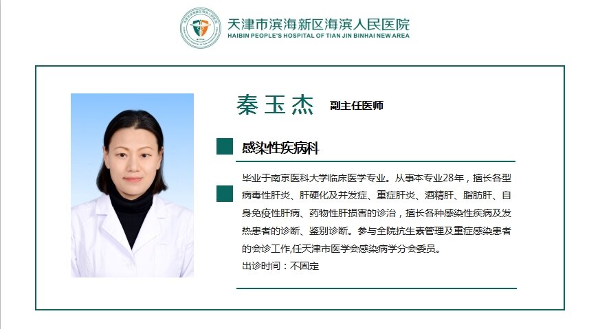 专家介绍 网站首页 > 医生介绍 > 专家介绍 > 正文 秦玉杰 感染性疾病科 毕业于南京医科大学临床医学专业,副主任医师职称。从事本专业28年,擅长各型病毒性肝炎、肝硬化及并发症、重症肝炎、酒精肝、脂肪肝、自身免疫性肝病、药物性肝损害的诊治,擅长各种感染性疾病及发热患者的诊断、鉴别诊断。参与全院抗生素管理及重症感染患者的会诊工作,任天津市医学会感染病学分会委员。 出诊时间:不固定