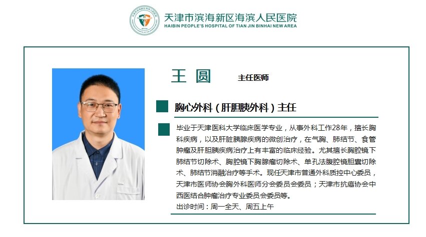 专家介绍 网站首页 > 医生介绍 > 专家介绍 > 正文 王 圆 胸心外科(肝胆外科) 胸心外科(肝胆胰外科)主任,毕业于天津医科大学临床医学专业,主任医师职称。从事外科工作28年,擅长胸科疾病,以及肝胆胰腺疾病的微创治疗,在气胸、肺结节、食管肿瘤及肝胆胰疾病治疗上有丰富的临床检验。尤其擅长胸腔镜下肺结节切除术、胸腔镜下胸腺瘤切除术、单孔法腹腔镜胆囊切除术、肺结节消融治疗等手术。现任天津市普通外科质控中心委员、天津市医师协会胸外科医师分会委员会委员、天津市抗癌协会中西医结合肿瘤治疗专业委员会委员等。 出诊时间:周一全天,周五上午