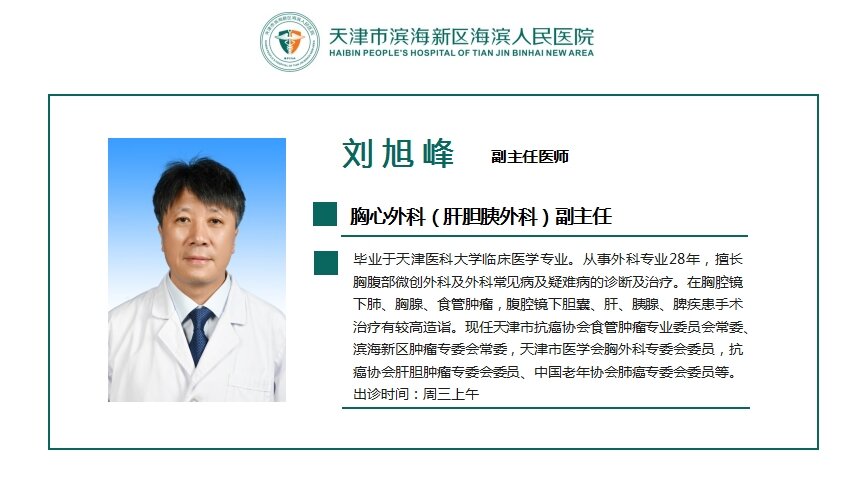 专家介绍 网站首页 > 医生介绍 > 专家介绍 > 正文 刘旭峰 胸心外科(肝胆外科) 胸心外科(肝胆胰外科)副主任,毕业于天津医科大学临床医学专业,副主任医师职称。从事外科专业28年,擅长胸腹部微创外科及外科常见病及疑难病的诊断及治疗。在胸腔镜下肺、胸腺、食管肿瘤,腹腔镜下胆囊,肝、胰腺、脾疾患手术治疗有较高造诣。现任天津市抗癌协会食管肿瘤专业委员会常委、滨海新区肿瘤专委会常委,天津市医学会胸外科专委会委员,抗癌协会肝胆肿瘤专委会委员,中国老年协会肺癌专委会委员等。 门诊时间:周三上午
