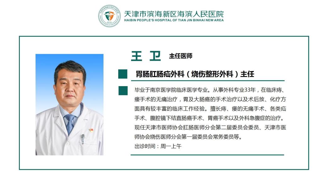 专家介绍 网站首页 > 医生介绍 > 专家介绍 > 正文 王 卫 胃肠外科(烧伤整形外科) 胃肠肛肠疝外科(烧伤整形外科)主任,毕业于南京医学院临床医学专业,主任医师职称。从事外科专业33年,在临床痔、瘘手术的无痛治疗,胃及大肠癌的手术治疗以及术后放、化疗方面具有较丰富的临床工作经验。擅长痔、瘘的无痛手术、各类疝手术、腹腔镜下结直肠癌手术、胃癌手术以及外科急腹症的治疗。现任天津市医师协会肛肠医师分会第二届委员会委员、天津市医师协会烧伤医师分会第一届委员会常务委员等。 出诊时间:周一上午