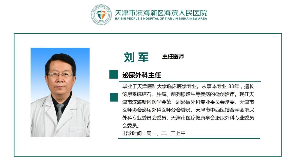 专家介绍 网站首页 > 医生介绍 > 专家介绍 > 正文 刘 军 泌尿外科 泌尿外科主任,毕业于天津医科大学临床医学专业,主任医师职称。从事本专业33年,擅长泌尿系统结石、肿瘤、前列腺增生等疾病的微创治疗。现任天津市滨海新区医学会第一届泌尿外科专业委员会常委、天津市医师协会泌尿外科医师分会委员、天津市中西医结合学会泌尿外科专业委员会委员、天津市医疗健康学会泌尿外科专业委员会委员。 出诊时间:周一、二、三上午