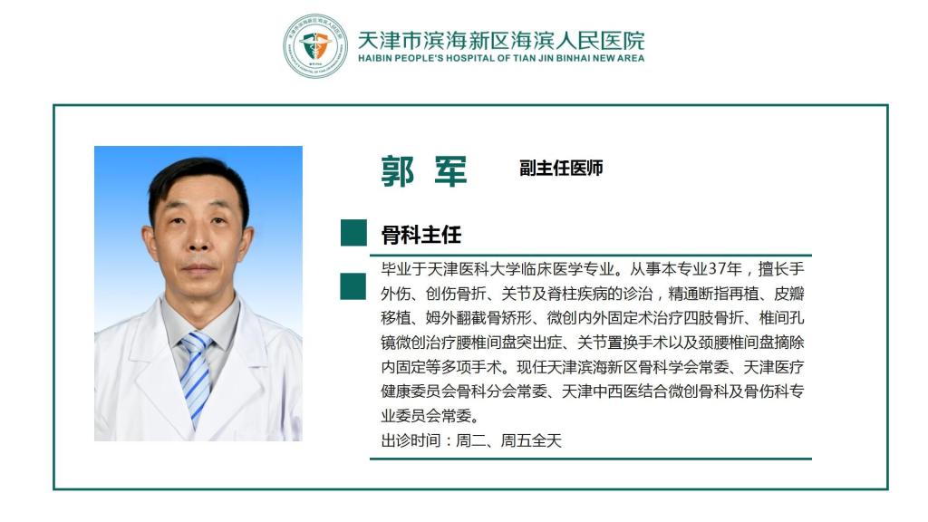 专家介绍 网站首页 > 医生介绍 > 专家介绍 > 正文 郭 军 骨科 骨科主任,毕业于天津医科大学临床医学专业,副主任医师职称。从事本专业37年,擅长手外伤、创伤骨折、关节及脊柱疾病的诊治,精通断指再植、皮瓣移植、姆外翻截骨矫形、微创内外固定术治疗四肢骨折、椎间孔镜微创治疗腰椎间盘突出症、关节置换手术以及颈腰椎间盘摘除内固定等多项手术。现任天津滨海新区骨科学会常委、天津医疗健康委员会骨科分会常委、天津中西医结合微创骨科及骨伤科专业委员会常委。 出诊时间:周二、周五全天