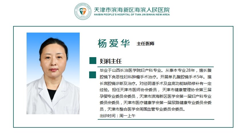 专家介绍 网站首页 > 医生介绍 > 专家介绍 > 正文 杨爱华 妇科 妇科主任,毕业于山西长治医学院妇产科专业,主任医师职称。从事本专业28年,擅长腹腔镜下良恶性妇科肿瘤手术治疗。开展单孔腹腔镜手术5年。擅长宫腔镜诊断及治疗。对经阴道手术及盆底功能缺陷修补有一定经验。担任天津市医师协会委员,天津市健康管理协会第三届孕婴专业委员会委员,天津市滨海新区医学会第一届妇产科专业委员会委员,天津市医疗健康学会第一届尿路健康专业委员会委员,天津市整合医学会周围血管专业委员会委员。 出诊时间:周一上午