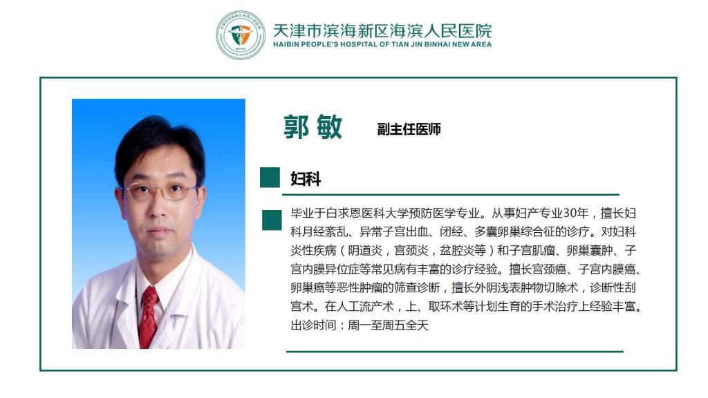 专家介绍 网站首页 > 医生介绍 > 专家介绍 > 正文 郭 敏 妇科 毕业于白求恩医科大学预防医学专业,副主任医师职称。从事妇产专业30年,擅长妇科月经紊乱、异常子宫出血、闭经、多囊卵巢综合征的诊疗。对妇科炎性疾病(阴道炎,宫颈炎,盆腔炎等)和子宫肌瘤、卵巢囊肿、子宫内膜异位症等常见病有丰富的诊疗经验。擅长宫颈癌、子宫内膜癌、卵巢癌等恶性肿瘤的筛查诊断,擅长外阴浅表肿物切除术,诊断性刮宫术。在人工流产术,上、取环术等计划生育的手术治疗上经验丰富。 出诊时间:周一至周五全天