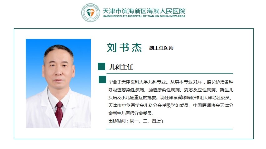 专家介绍 网站首页 > 医生介绍 > 专家介绍 > 正文 刘书杰 儿科 儿科主任,毕业于天津医科大学儿科专业,副主任医师职称。从事本专业31年,擅长诊治各种呼吸道感染性疾病、肠道感染性疾病、变态反应性疾病、新生儿疾病及小儿危重症的抢救。现任津京冀哮喘协作组天津地区委员、天津市中华医学会儿科分会呼吸学组委员、中国医师协会天津分会新生儿医师分会委员。 出诊时间:周一、二、四上午