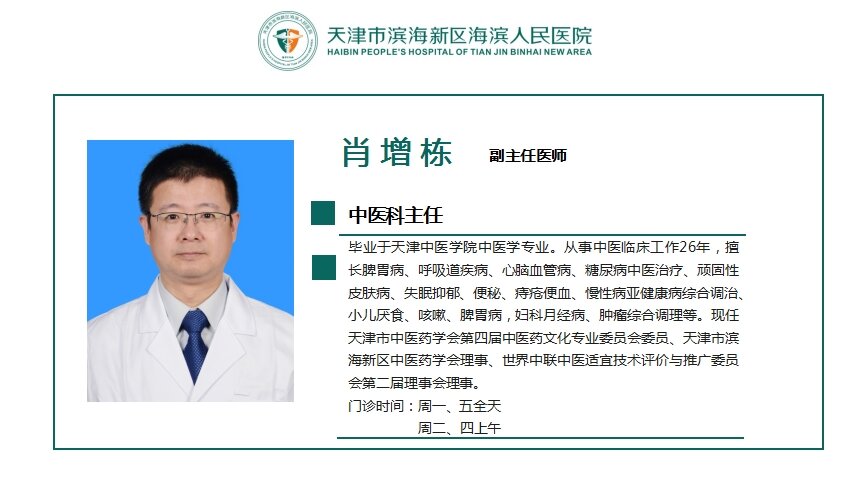 专家介绍 网站首页 > 医生介绍 > 专家介绍 > 正文 肖增栋 中医科 中医科主任,毕业于天津中医学院中医学专业。副主任医师职称。从事中医临床工作26年,擅长脾胃病、呼吸道疾病、心脑血管病、糖尿病中医治疗、顽固性皮肤病、失眠抑郁、便秘、痔疮便血、慢性病亚健康病综合调治、小儿厌食、咳嗽、脾胃病,妇科月经病、肿瘤综合调理等。现任天津市中医药学会第四届中医药文化专业委员会委员、天津市滨海新区中医药学会理事、世界中联中医适宜技术评价与推广委员会第二届理事会理事。 门诊时间:周一、五全天 周二、四上午