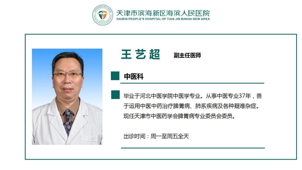 专家介绍 网站首页 > 医生介绍 > 专家介绍 > 正文 王艺超 中医科 毕业于河北中医学院中医学专业,副主任医师职称。从事中医专业37年,善于运用中医中药治疗脾胃病、肺系疾病及各种疑难杂症。现任天津市中医药学会脾胃病专业委员会委员。 出诊时间:周一至周五全天