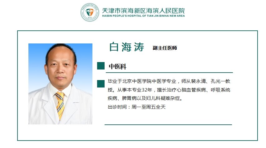 专家介绍 网站首页 > 医生介绍 > 专家介绍 > 正文 白海涛 中医科 毕业于北京中医学院中医学专业,师从裴永清、孔光一教授,副主任医师职称。从事本专业32年,擅长治疗心脑血管疾病、呼吸系统疾病、脾胃病以及妇儿科疑难杂症。 出诊时间:周一至周五全天