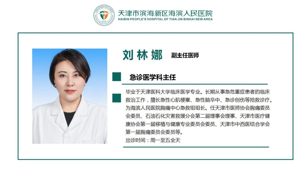 专家介绍 网站首页 > 医生介绍 > 专家介绍 > 正文 刘林娜 急诊医学科 急诊医学科主任,毕业于天津医科大学临床医学专业,副主任医师职称。长期从事急危重症患者的临床救治工作,擅长急性心肌梗塞、急性脑卒中、急诊创伤等抢救诊疗。为海滨人民医院胸痛中心急救组组长。任天津市医师协会胸痛委员会委员、石油石化灾害救援分会第二届理事会理事、天津市医疗健康协会第一届移植与健康专业委员会委员、天津市中西医结合学会第一届胸痛委员会委员等。 出诊时间:周一至五全天