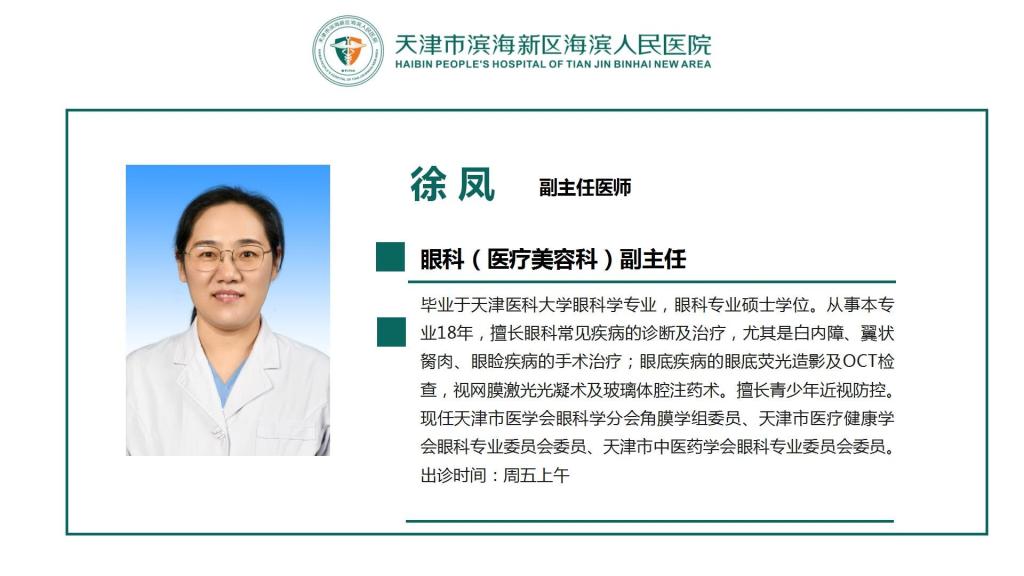 专家介绍 网站首页 > 医生介绍 > 专家介绍 > 正文 徐 凤 眼科(医疗美容科) 眼科(医疗美容科)副主任,毕业于天津医科大学眼科学专业,眼科专业硕士学位,副主任医师职称。从事本专业18年,擅长眼科常见疾病的诊断及治疗,尤其是白内障、翼状胬肉、眼睑疾病的手术治疗;眼底疾病的眼底荧光造影及OCT检查,视网膜激光光凝术及玻璃体腔注药术。擅长青少年近视防控。现任天津市医学会眼科学分会角膜学组委员、天津市医疗健康学会眼科专业委员会委员、天津市中医药学会眼科专业委员会委员。 出诊时间:周五上午