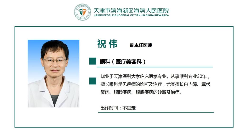 专家介绍 网站首页 > 医生介绍 > 专家介绍 > 正文 祝 伟 眼科(医疗美容科) 毕业于天津医科大学临床医学专业,副主任医师职称。从事眼科专业30年,擅长眼科常见疾病的诊断及治疗,尤其擅长白内障、翼状胬肉、眼睑疾病、眼底疾病的诊断及治疗。 出诊时间:不固定
