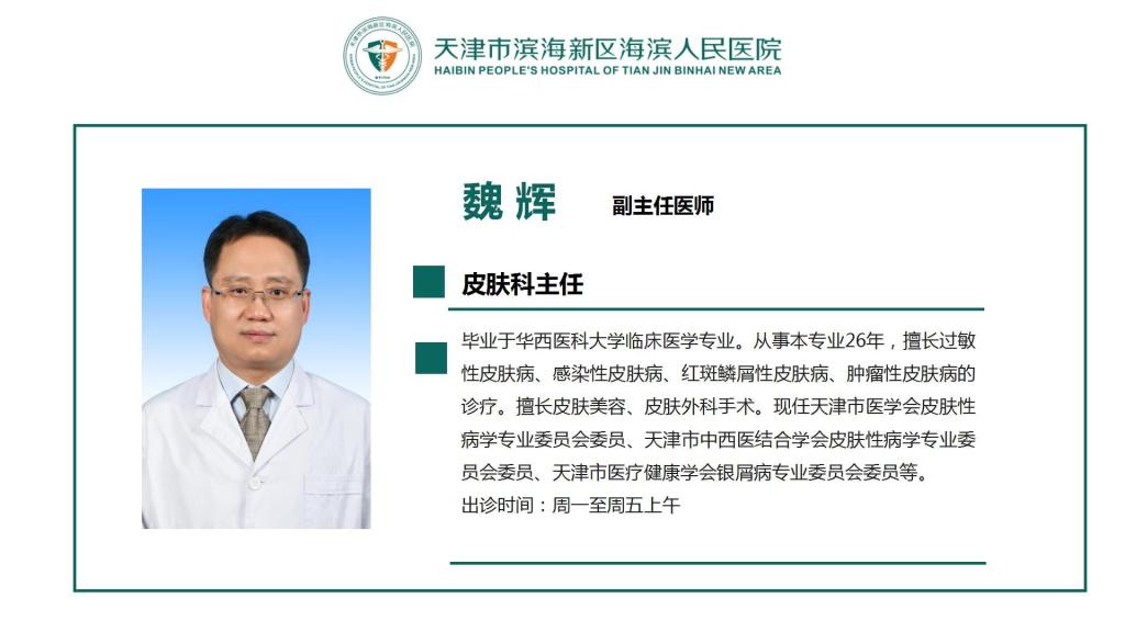 专家介绍 网站首页 > 医生介绍 > 专家介绍 > 正文 魏 辉 皮肤科 皮肤科主任,毕业于华西医科大学临床医学专业,副主任医师职称。从事本专业26年,擅长过敏性皮肤病、感染性皮肤病、红斑鳞屑性皮肤病、肿瘤性皮肤病的诊疗。擅长皮肤美容、皮肤外科手术。现任天津市医学会皮肤性病学专业委员会委员、天津市中西医结合学会皮肤性病学专业委员会委员、天津市医疗健康学会银屑病专业委员会委员等。 出诊时间:周一至周五上午
