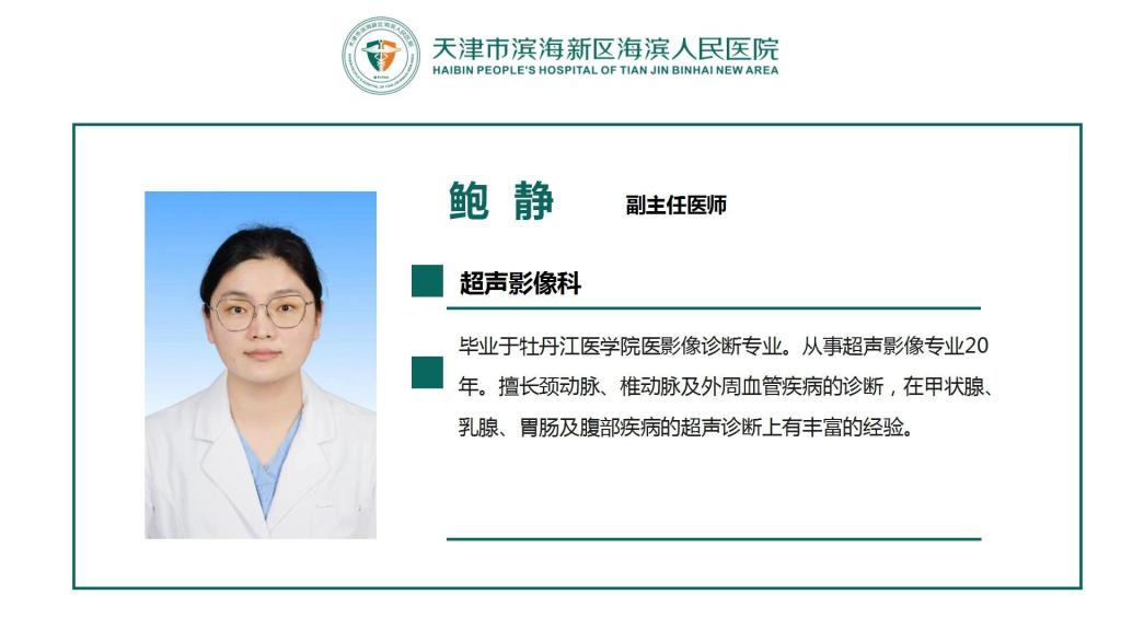 专家介绍 网站首页 > 医生介绍 > 专家介绍 > 正文 鲍静 超声影像学科 毕业于牡丹江医学院医影像诊断专业,副主任医师职称,从事超声影像专业20年。擅长颈动脉、椎动脉及外周血管疾病的诊断,在甲状腺、乳腺、胃肠及腹部疾病的超声诊断上有丰富的经验。