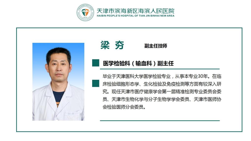 专家介绍 网站首页 > 医生介绍 > 专家介绍 > 正文 梁夯 医学检验科(输血科) 医学检验科(输血科)副主任,毕业于天津医科大学医学检验专业,副主任技师职称,从事本专业30年。在临床检验细胞形态学、生化检验及免疫检测等方面有较深入研究。现任天津市医疗健康学会第一届精准检测专业委员会委员、天津市生物化学与分子生物学学会委员、天津市医师协会检验医师分会委员。