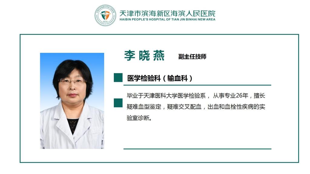 专家介绍 网站首页 > 医生介绍 > 专家介绍 > 正文 李晓燕 医学检验科(输血科) 毕业于天津医科大学医学检验系,副主任技师职称,从事专业26年。擅长疑难血型鉴定,疑难交叉配血,出血和血栓性疾病的实验室诊断。