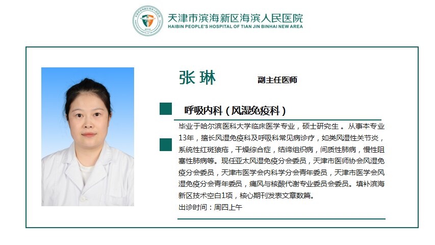 专家介绍 网站首页 > 医生介绍 > 专家介绍 > 正文 张琳 呼吸内科(风湿免疫科) 毕业于哈尔滨医科大学临床医学专业,硕士研究生。从事本专业13年,擅长风湿免疫科及呼吸科常见病诊疗,如类风湿性关节炎,系统性红斑狼疮,干燥综合征,结缔组织病,间质性肺病,慢性阻塞性肺病等。现任亚太风湿免疫分会委员,天津市医师协会风湿免疫分会委员,天津市医学会内科学分会青年委员,天津市医学会风湿免疫分会青年委员,痛风与核酸代谢专业委员会委员。填补滨海新区技术空白1项,核心期刊发表文章数篇。 出诊时间:周四上午