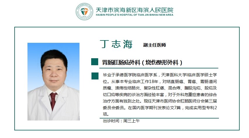 专家介绍 网站首页 > 医生介绍 > 专家介绍 > 正文 丁志海 胃肠肛肠疝外科(烧伤整形外科) 毕业于承德医学院临床医学系,天津医科大学|临床医学硕士学位。从事本专业临床工作18年,对结直肠癌、胃癌、胃肠道间质瘤、溃疡性结肠炎、复杂性肛瘘、混合痔、腹股沟疝、股疝及切口疝等疾病的诊治方面经验丰富,对于外科危重症患者的综合治疗方面有独到之处。现任天津市医师协会肛肠医师分会第三届委员会委员。在国内医学期刊发表论文7篇,完成实用型专利2项。 出诊时间:周三上午