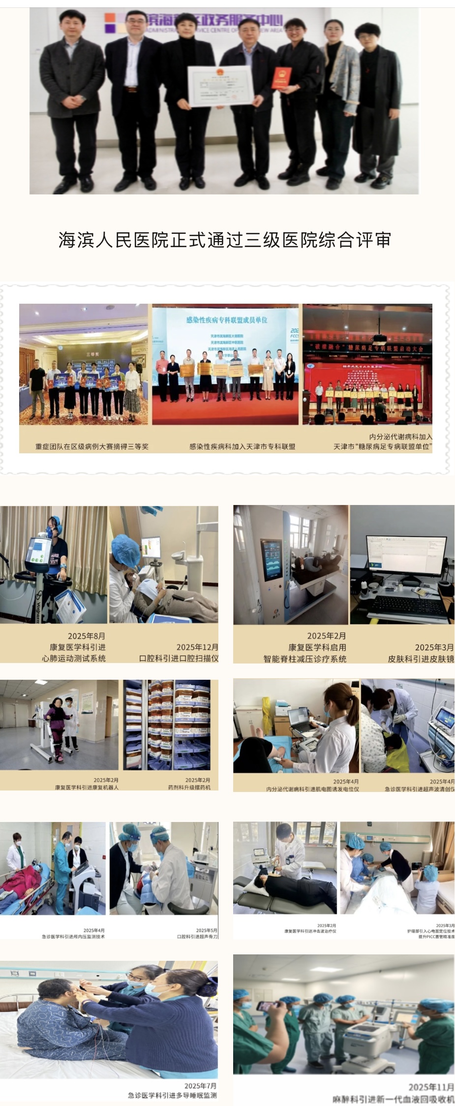 这一年,我们夯基拓进,让“实干争先”铸就卓越台阶。2025年3月,医院正式晋级为三级综合医院,迈入发展新阶段。年内相继获批中国抗癌协会(CACA)“整合药学+临床”全程管理护航工程联动病房,感染性疾病科、内分泌代谢病科分别加入天津市专科联盟及糖尿病足专病联盟。硬件升级同步推进,完成10个病区改造,就医环境显著优化。引进康复机器人、超声骨刀、心肺运动测试系统、智能脊柱减压系统等先进设备,持续推进重点专科建设。海医以“一体六翼”战略为指引,服务能力持续向好。
